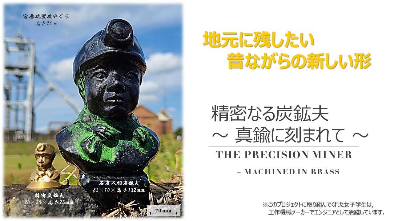 本作品は,大牟田・荒尾 両市にまたがる三池炭鉱の石炭ピッチから作られていた「石炭人形 炭鉱夫」形状をデータ化し,NC工作機械を使って真鍮に精密加工した物で,大きさは20mm×20mm×25mmと,手のひらに載せることができるくらい小さなものです.